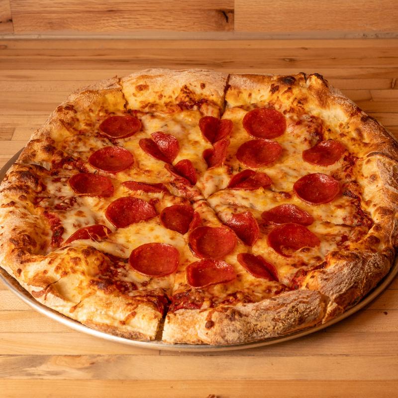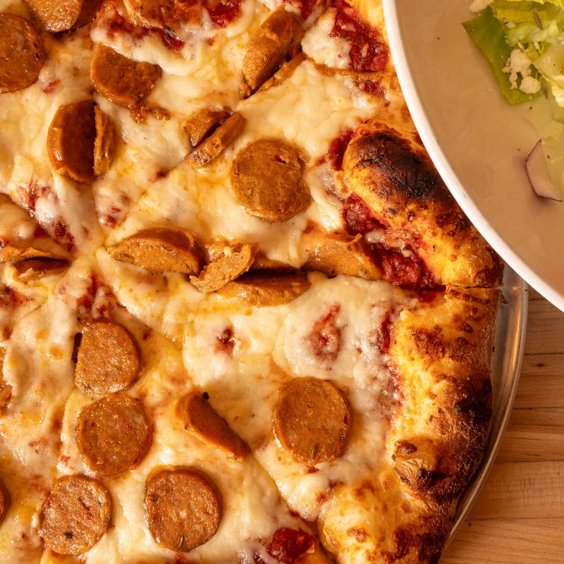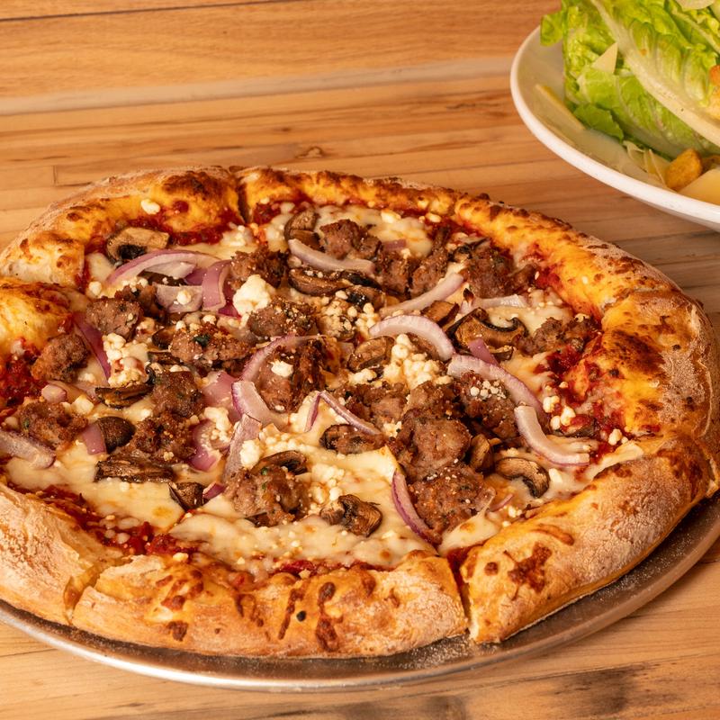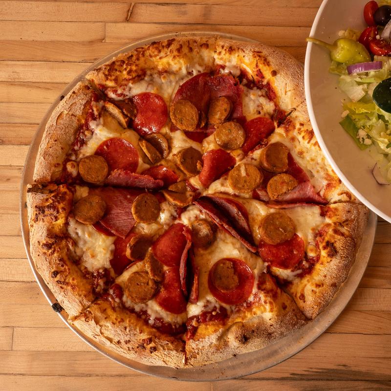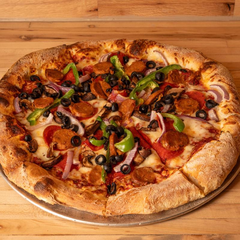 House made pizza sauce, mozzarella, pepperoni, sausage, cremini mushrooms, green bell peppers, red onions, black olives.