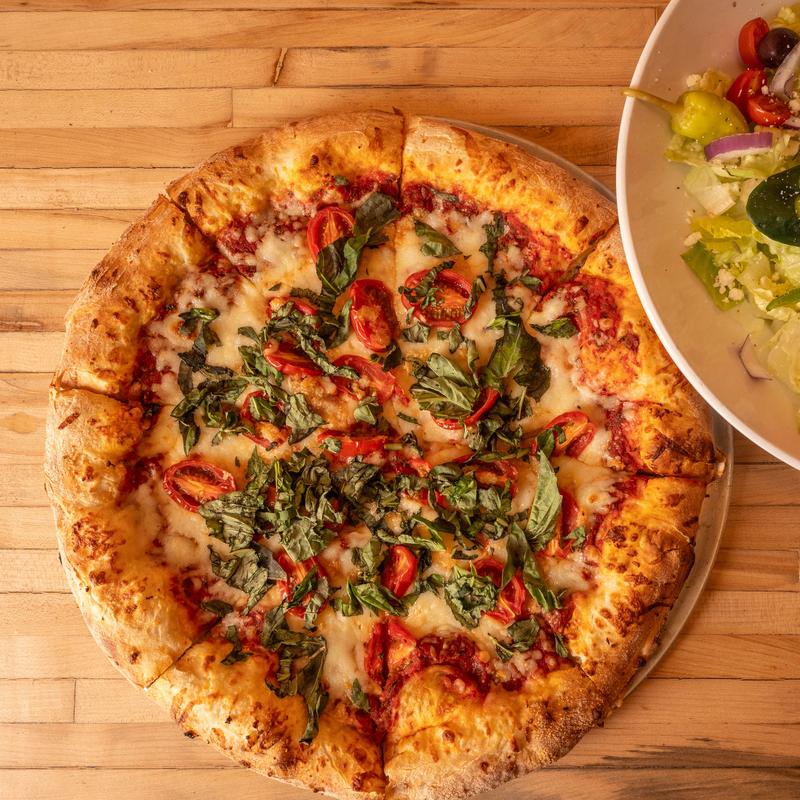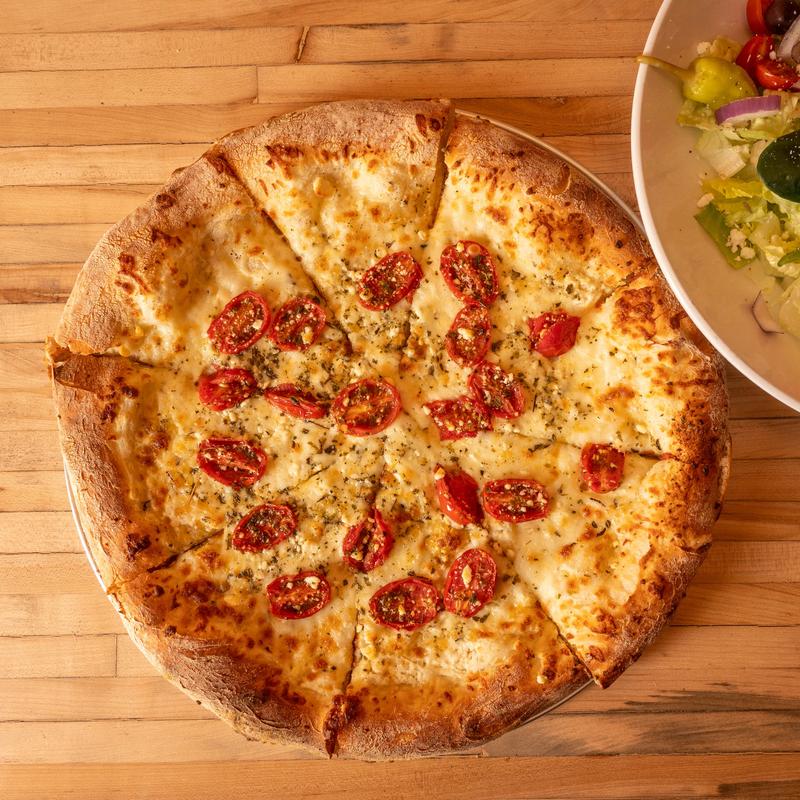House made pizza sauce, mozzarella, grape tomatoes, basil, garlic.