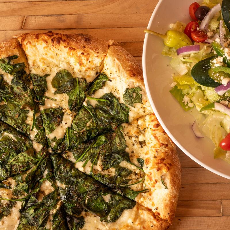 House made pizza sauce, mozzarella, goat cheese, onion, cremini mushrooms, spinach.